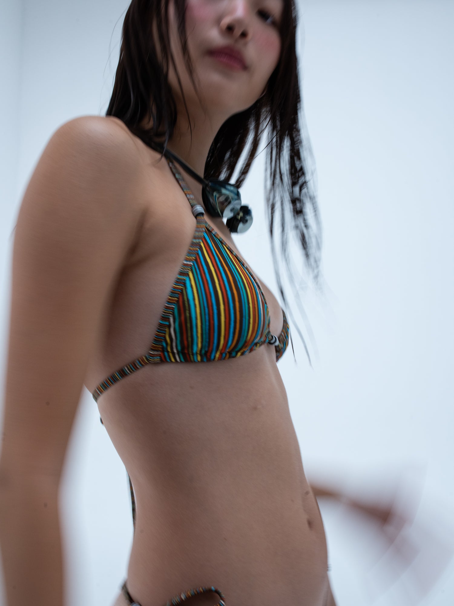 our iconic cristina top in custom ribbed key west stripe print is our twist on the classic 80's triangle bikini top. this top has smaller scaled stripe as the contrast elastic strings and our signature black & white beads at the center bust and tie ends. we've been told this top is a "boob lift in a bikini top" thanks to the supportive elastic at all edges. this top was made to mix & match with any bottom from our key west collection.
