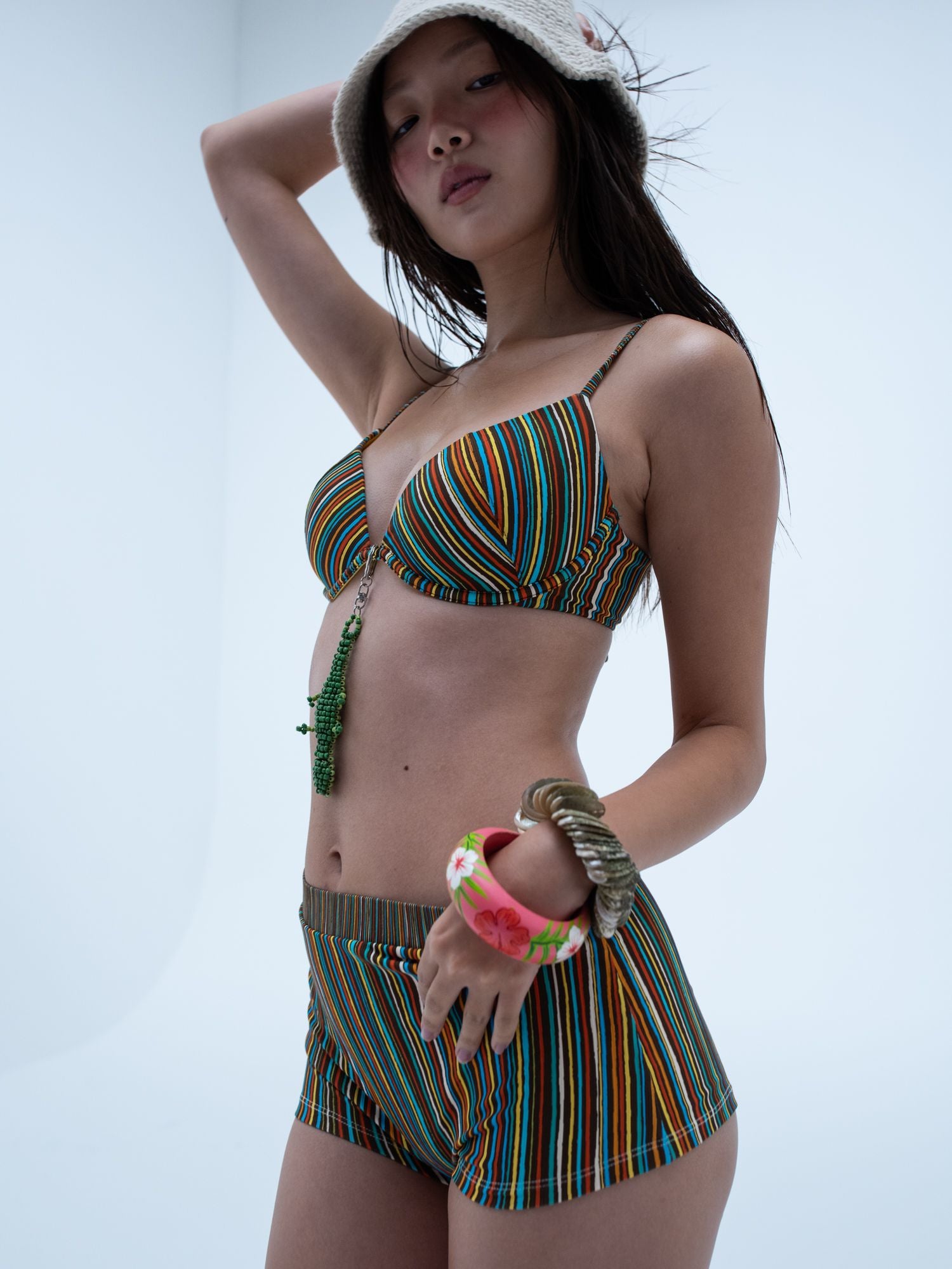 the fifi short in our custom ribbed stripe print, key west. the hottest addition to your bikini wardrobe. with a high waisted stretchy yet cheeky design, these shorts offer the perfect amount of stretch and comfort needed for all your summer activities. wear on their own or over your favorite goldie bikini bottom.