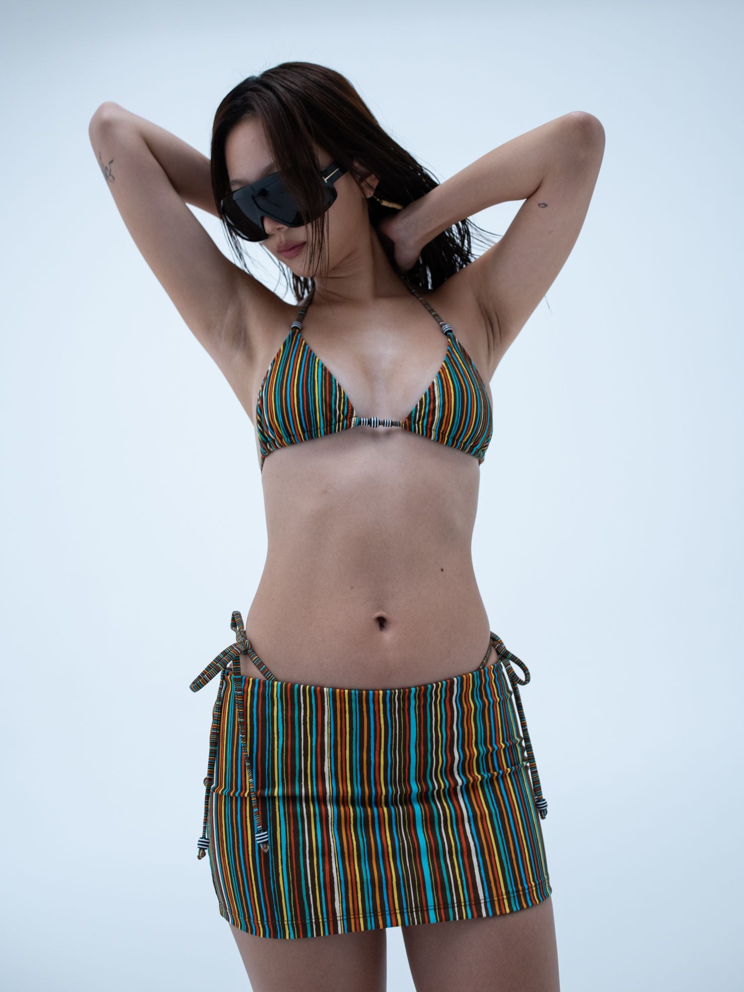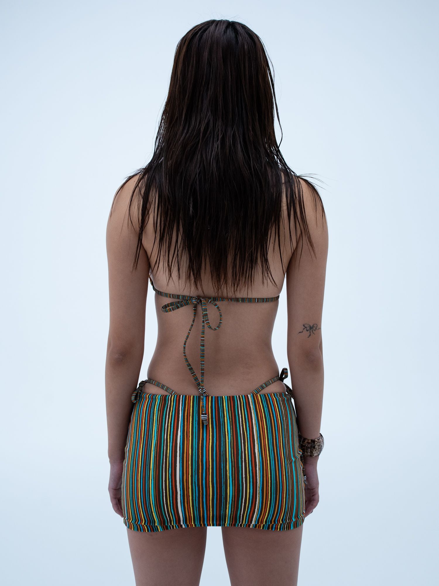 bringing back our petra skirt with an updated fit in our custom stripe print, key west. this skirt is sure to flatter with its seamless waist band and low to mid-rise fit. the perfect addition to your swim coverup or going out wardrobe. this updated version offers a subtle curved hem for additional back coverage