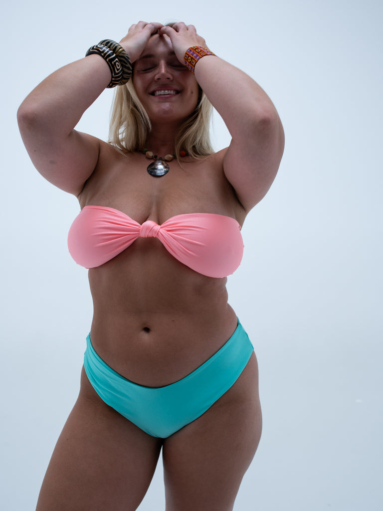 our new frida bandeau top in pastel shimmer. made with three layers of our essentials fabric, boning at the sides, a secure center knot detail and adjustable back clasp. this design keeps your top in place, giving you peace of mind throughout all your summer activities. this top was made to be mix and matched with any bottom from our pastel shimmer collection.