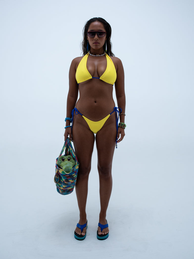 the goldie essentials’ selma cheeky bottom is minimal coverage string bikini made to be worn high or low on the hips. designed with with white zigzag stitching, blue strings and signature beading at the tie-ends, this cheeky bikini bottom can be mixed and matched with any top in the essentials or goldie exclusive print collections.