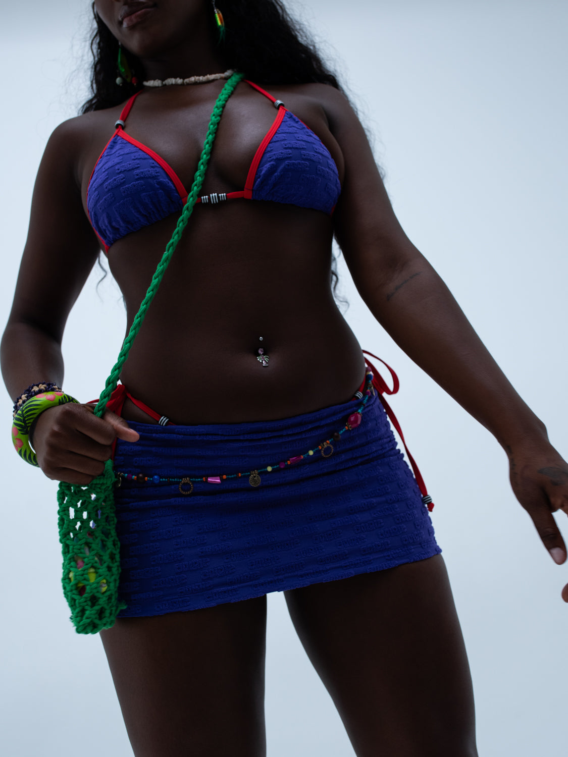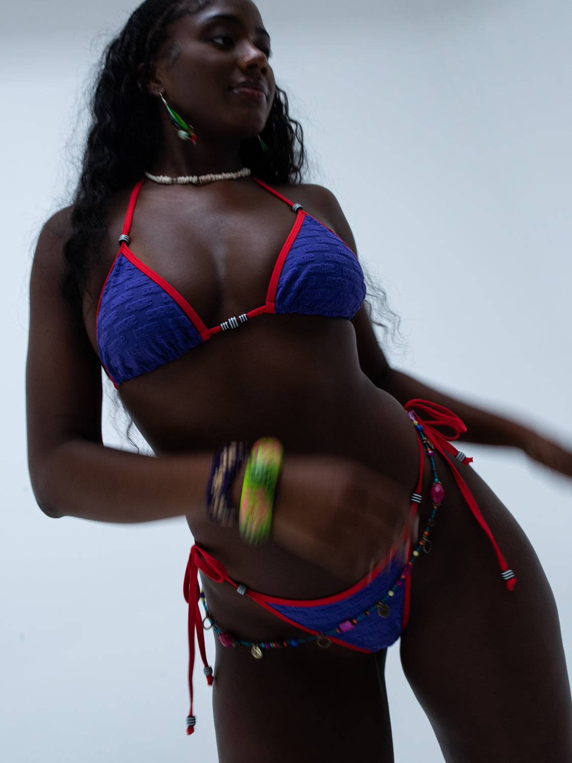 the goldie essentials' cristina top in our custom purple logo terry fabric. designed with red contrast strings and signature beading at the tie-ends and center, this bikini top can be mixed and matched with any bottom in the purple logo terry collection.