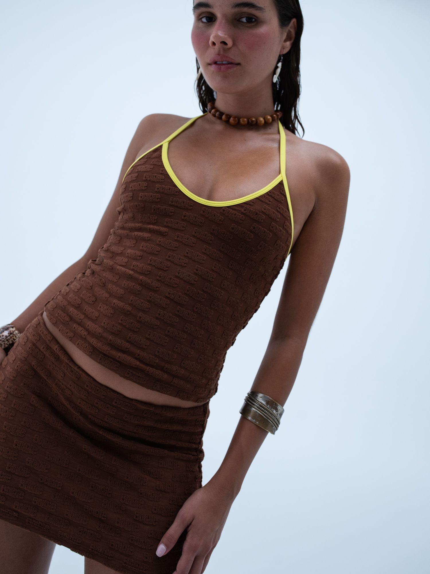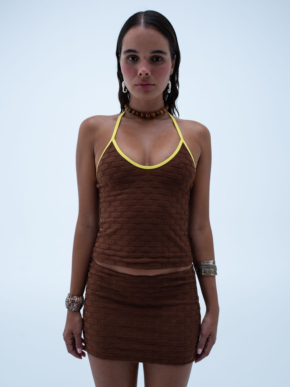 the tankini is here to stay! introducing our newest swim tank top style, the margo; available in our custom brown logo terry. the margo halter tank top was designed with a dramatic scooped neck front and adjustable slider clasp halter for a flattering figure-hugging fit. this top is double lined with no shelf bra and looks equally cute styled on the go with a pair of low rise jeans or linen pants.