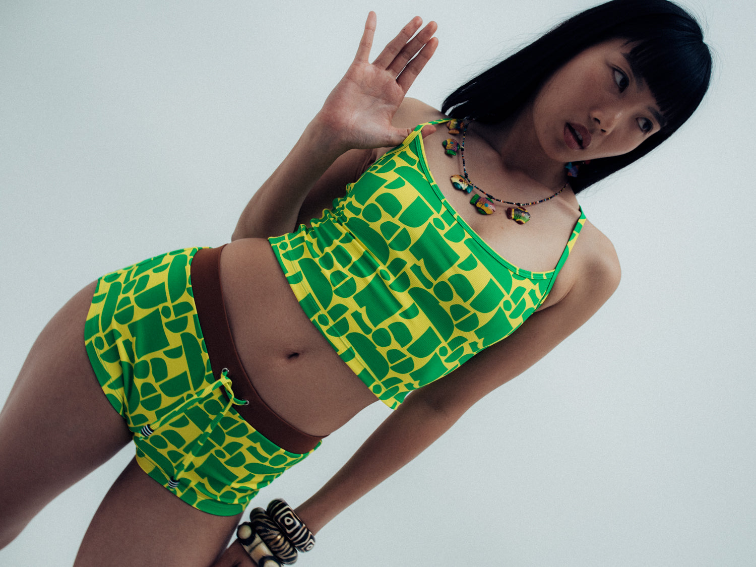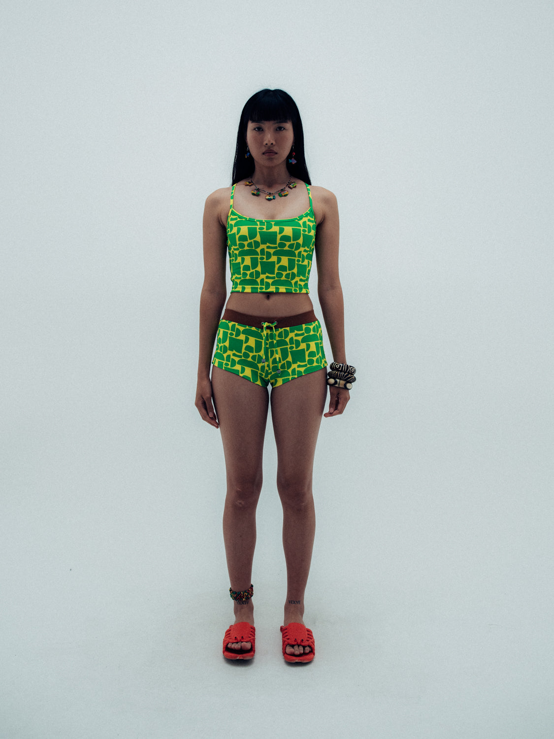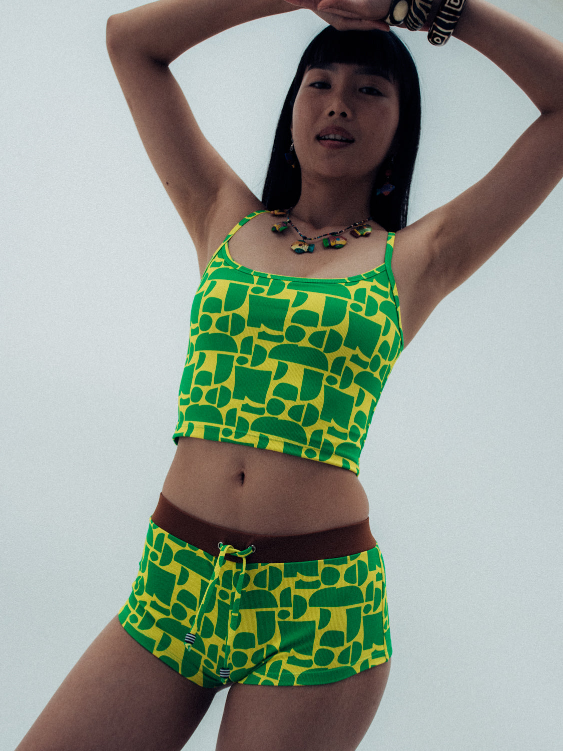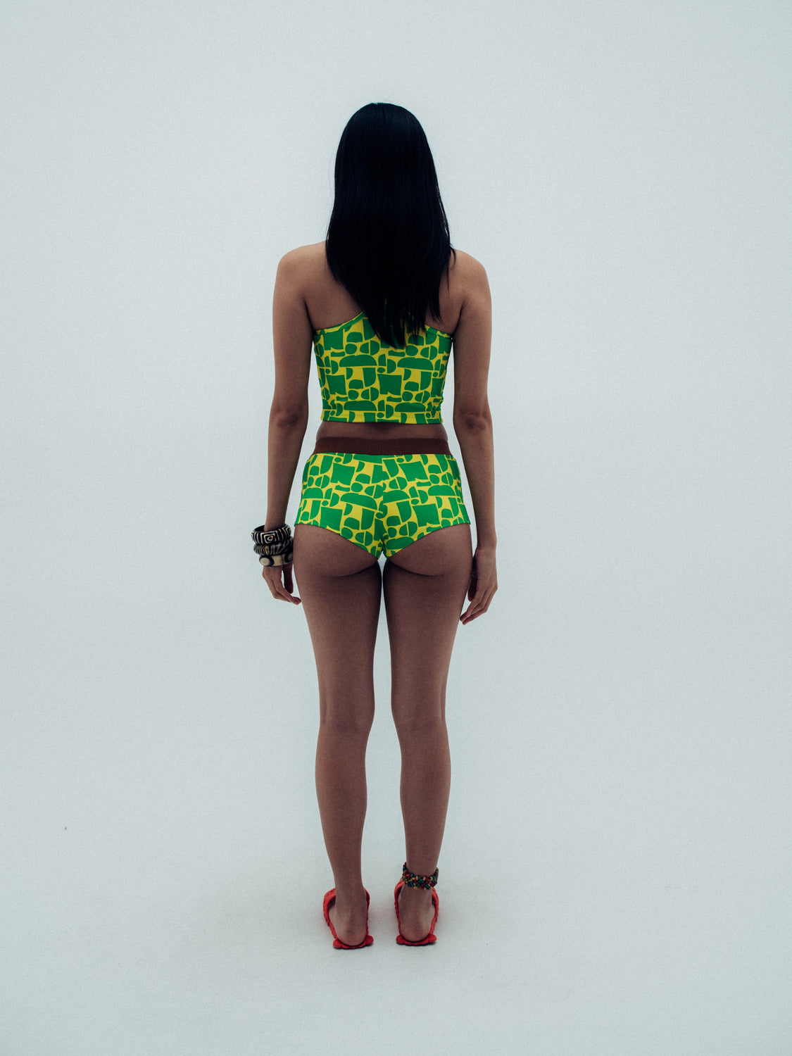 introducing our newest swim short to the goldie girl crew, the naya short. named after one of our favorite surfing goldie girls and inspired by the surf brands we wore boogie boarding as kids. with a wide elastic waist band and mid rise fit, self-tie detailing and goldie signature beads, this is the perfect short for beach to street wear in our luxe ribbed, custom hand drawn rio print. made to be mixed and matched with any top from the rio collection or incorporated into your existing goldie bikini drawer.